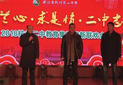 联欢活动持续了两个小时,二中大家庭的成员们相聚一堂,其乐融融,气氛热烈而温馨。各个学校精心制作的回顾视频创意十足,角度新颖,大气磅礴,展示了一年来在学校发展和师生成长等方面取得的丰硕成果,令人激情澎湃!大家一起展望2018,共同祝福杭州二中教育集团取得更大的辉煌!■陆华
