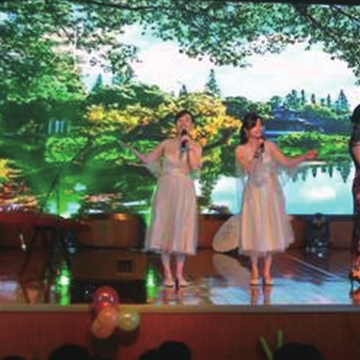杭州二中教育集团的各校区的节目精彩纷呈:江南实验学校的校园十大新闻刚刚播报完,天真可爱的孩子们走上舞台剪起了窗花,当粉妆玉琢的孩子遇上传统民间工艺,江南实验学校的舞蹈《剪窗花》碰撞出的岂止是欣喜?东河校区将古筝的行云流水,书法的刚劲潇洒,旗袍的婀娜多姿,茶艺的雅致清新相结合,两位温婉的女教师为我们献上了烟雨如画,精美绝伦的《人间西湖》;2030十印创·未来深深走进了白马湖人的心中,遥想2030年,白马湖的第一批孩子即将走上社会,他们会成为怎样的人呢?是否会带着这份白马湖特质走进工作岗位?白马湖学校立足2030年,畅想学校发展的将来,为我们献上情景剧《湖润未来》;滨江校区高二年级诸葛一朔与余珊两位老师幽默风趣地为我们表演脱口秀《二中新闻联播》;滨江校区高一年级的年青教师们以萌萌的形象为我们献上欢快的青春舞曲《疯狂动物园》;东河校区新进的六位教师为我们表演诗朗诵《在这里,我们将创造奇迹》;穿着紫红上衣的东河校区的女教师们为我们展示健美的身姿———《舞动新春》;当薄如蝉翼的七彩翅膀在舞台两边闪烁,盛开的牡丹惊艳全场,白马湖学校歌伴舞《人间西湖》再次用华美的歌声传达惊艳芳华。滨江校区高三年级的师生一曲合唱《彩虹》,让我们憧憬着5个月后的辉煌,将晚会的气氛推向高潮。