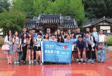 随后我们来到了安东大学,韩国第二大国立大学。一开始我们就被安东大学的校徽所吸引。安东AD,简单的字母,却拼凑出来韩国著名古村落河回村的样子。我们参观了图书馆,阳光透过玻璃,绿绿的树叶在呼吸,三五个学生坐在一起,大学的氛围就这么静悄悄地蔓延。大学的女生宿舍安保系统十分完善,宿舍都是木制地板和家具,令游学团的小伙伴们都十分羡慕。不仅如此,安东大学还有自己的体育馆,游泳、高尔夫等。参观安东大学的博物馆时,我们听了一个用头发编织草鞋祈愿丈夫平安的凄美爱情故事。韩国古字是用汉字的“如宝”来定义妻子,如同宝贝,这是一个丈夫对自己心爱女人所许的承诺。“当生”则是丈夫,把丈夫当作自己的一生,那是女子对自己所托终生的依赖。随后安东大学的孔子学院接待我们进行交流学习,遍布全球的孔子学院已经将“中国梦”的种子撒遍世界的每个角落。安东大学的本科学生还和我们进行了座谈式交流。在这一过程中,我感受到了韩国乃至世界对中国的重视。后期参观的亚洲四强首尔大学,用流行的话说是高端大气上档次,校园大到有自己的公交线路,据说里面的学生也难以熟悉大学的全部楼层。