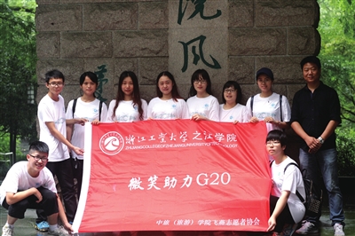 同时中旅(旅游)学院开展“微笑助力G20”志愿服务活动,学院30名志愿者在杭州西湖微笑亭展现了他们的活力与风采,为G20助力。活动中志愿者们结合自身专业知识,为游客们提供旅游咨询、外语翻译以及送凉茶服务并向市民、游客宣传G20峰会,提倡绿色、文明、环保、健康的旅游方式,为保护西湖环境和传播杭州文化贡献自己微薄之力。据悉,微笑志愿者们还开展了西湖文化、茶文化等培训,结合G20文明宣传、两美浙江建设,以实际行动纪念建党95周年。通过参与“微笑助力G20”志愿活动,以倡导做文明有礼浙江人的方式,表达高校学生“齐心服务G20,青春奉献十三五”的决心。